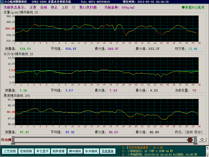 如上圖所示該畫面顯示紙張定量、水分及厚度等參數的橫向變化,畫面保存更人性化,只要點擊各畫面中的界面保存按鈕,界面自動會保存,此功能是我公司最新研開發出來的。